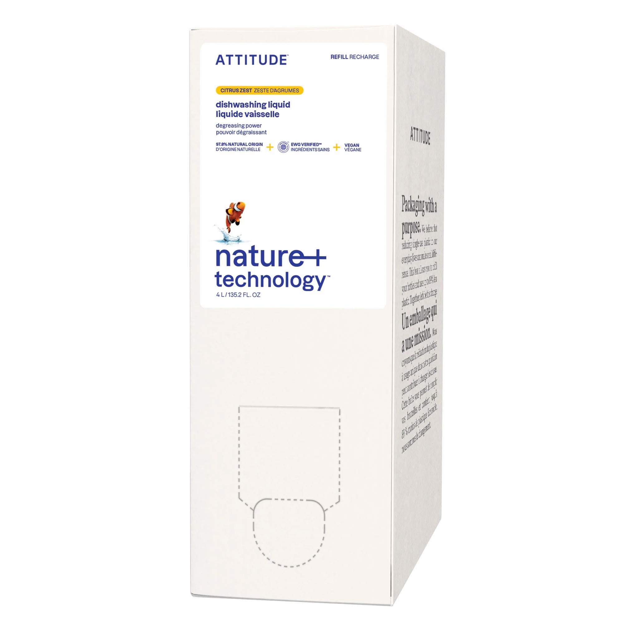 Formulated with 97% naturally derived ingredients, ATTITUDE⢠dishwashing liquid with strong degreasing power is your new home essential. Its invigorating citrus top notes blend harmoniously with floral and herbaceous lavender, creating a soothing and revitalizing ambiance in your kitchen. Its formula is EWG VERIFIED⢠and vegan. This dishwashing liquid is offered in a 4 L eco-refill format thatâs practical to use at home.