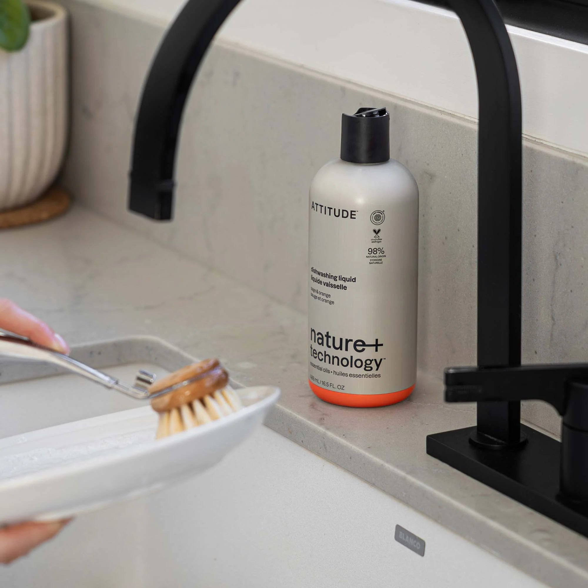Its balanced fragrance of vibrant, juicy orange, complemented by a herbal heart of sage, fills your kitchen with a refreshing aroma with every use.