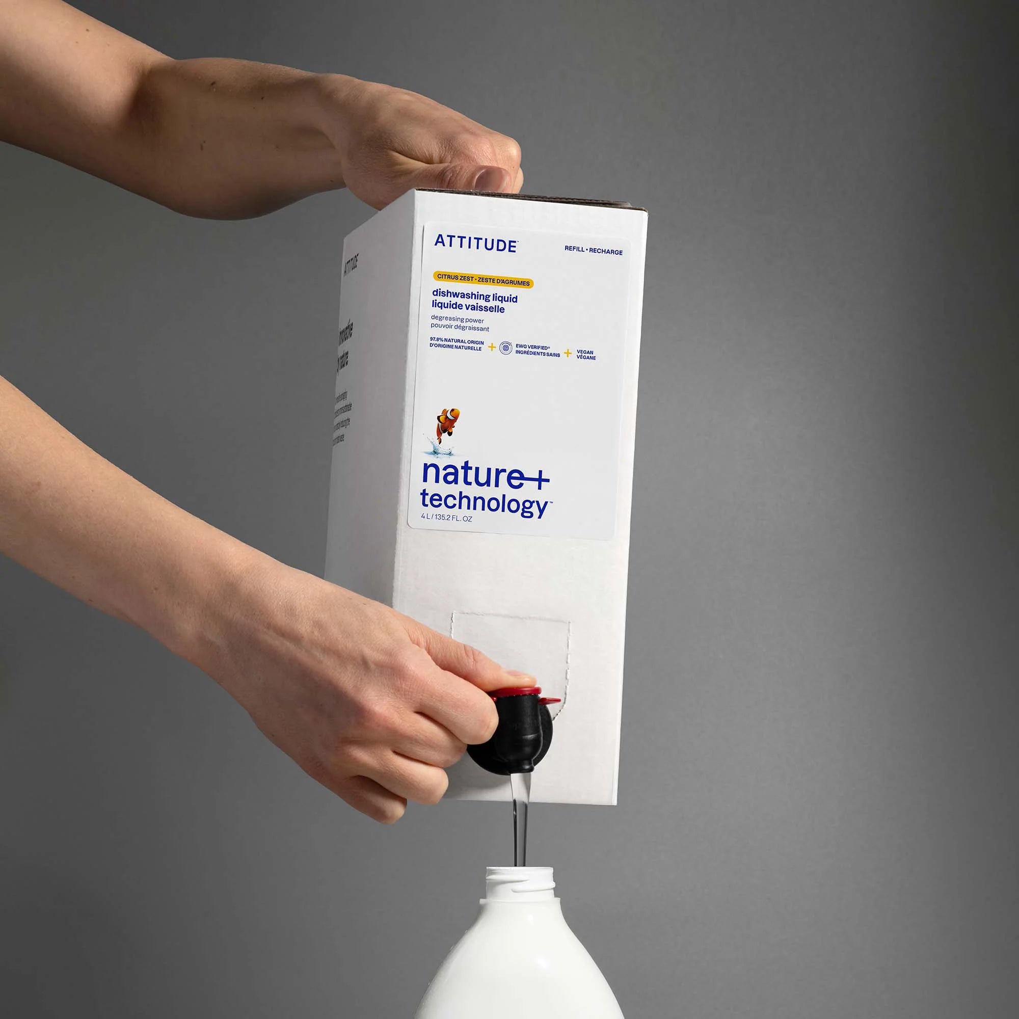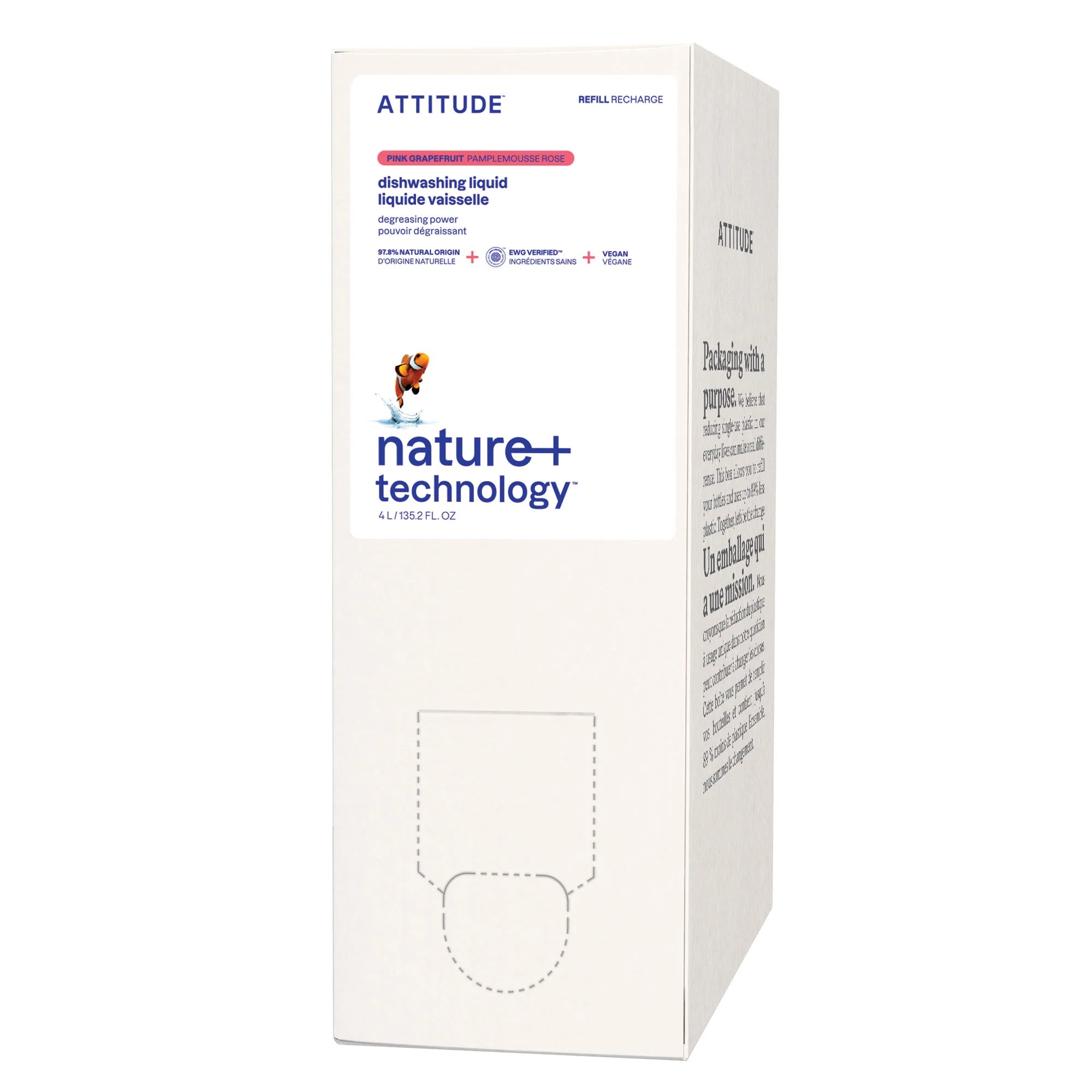Formulated with 97% naturally derived ingredients,ATTITUDE⢠dishwashing liquid with strong degreasing power is your new home essential. Its lively pink grapefruit notes blend harmoniously with the gentle floral tones of orange blossom. Its aromatic blend will give your kitchen a sunburst of energy. Its formula is completely vegan. This dishwashing liquid is offered in a 4 L eco-refill format thatâs practical to use at home.