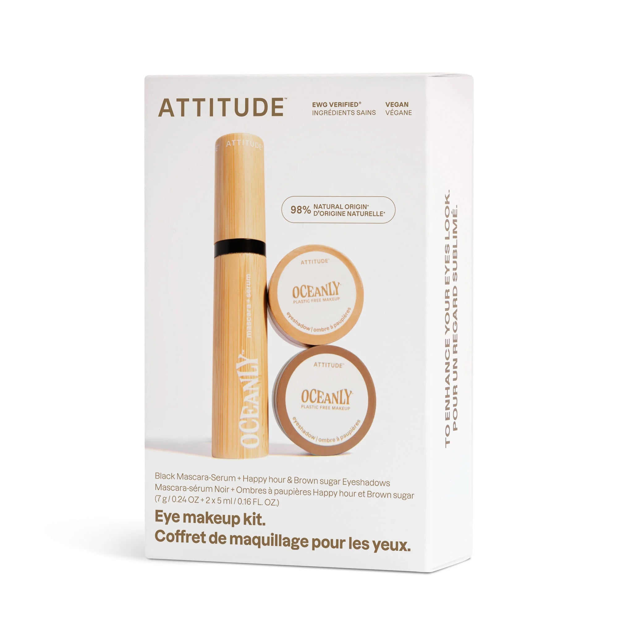 This set is perfect for enhancing your eyes and adding a fresh touch to your daily makeup routine. It includes our black Mascara+Serum and two brown eyeshadows. Their innovative formulas are enriched with +98.2% natural origin ingredients such as Tahitian microalgae and castor oil for the mascara, and phytoglycogen, known for its hydrating properties, for the eyeshadows. The Happy Hour and Brown Sugar eyeshadow shades allow you to create a variety of looks, from natural to sophisticated, while the mascara revitalizes your lashes and adds volume. EWG VERIFIED® and vegan certified, this set is perfect for your makeup routine or as a gift.