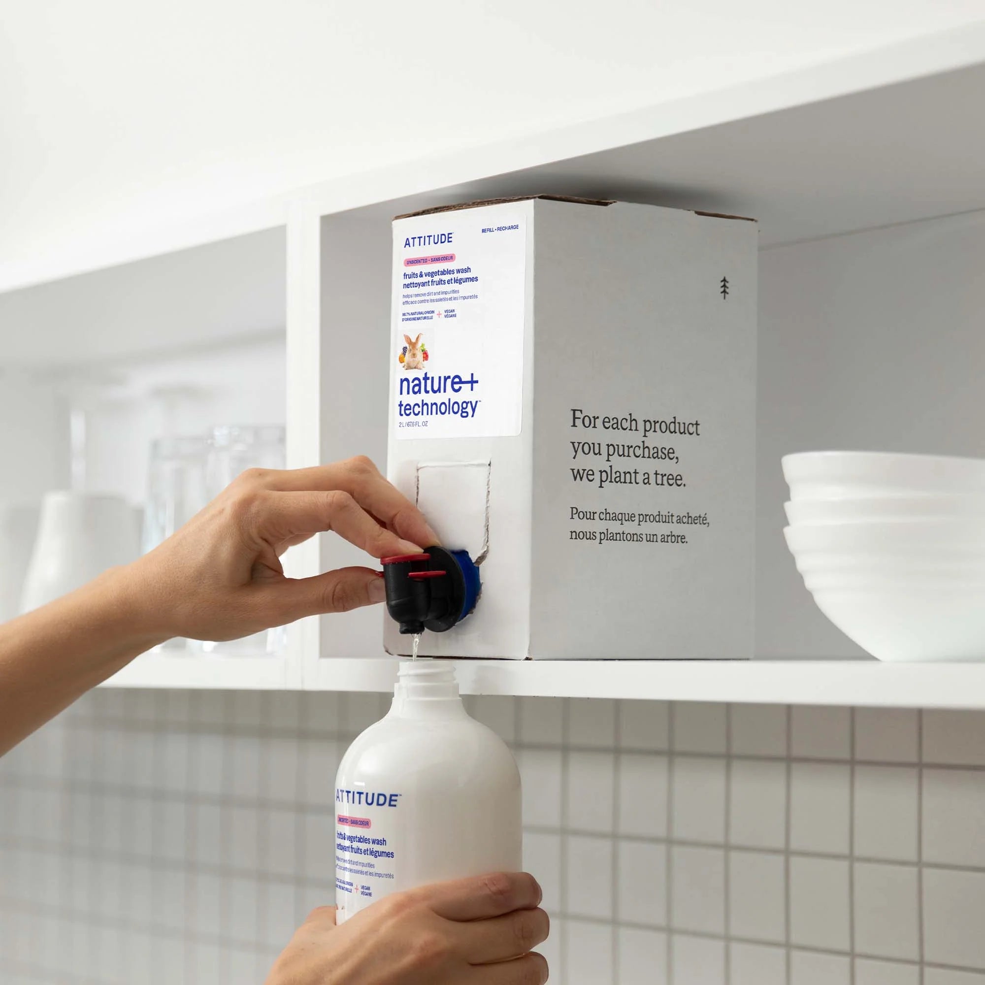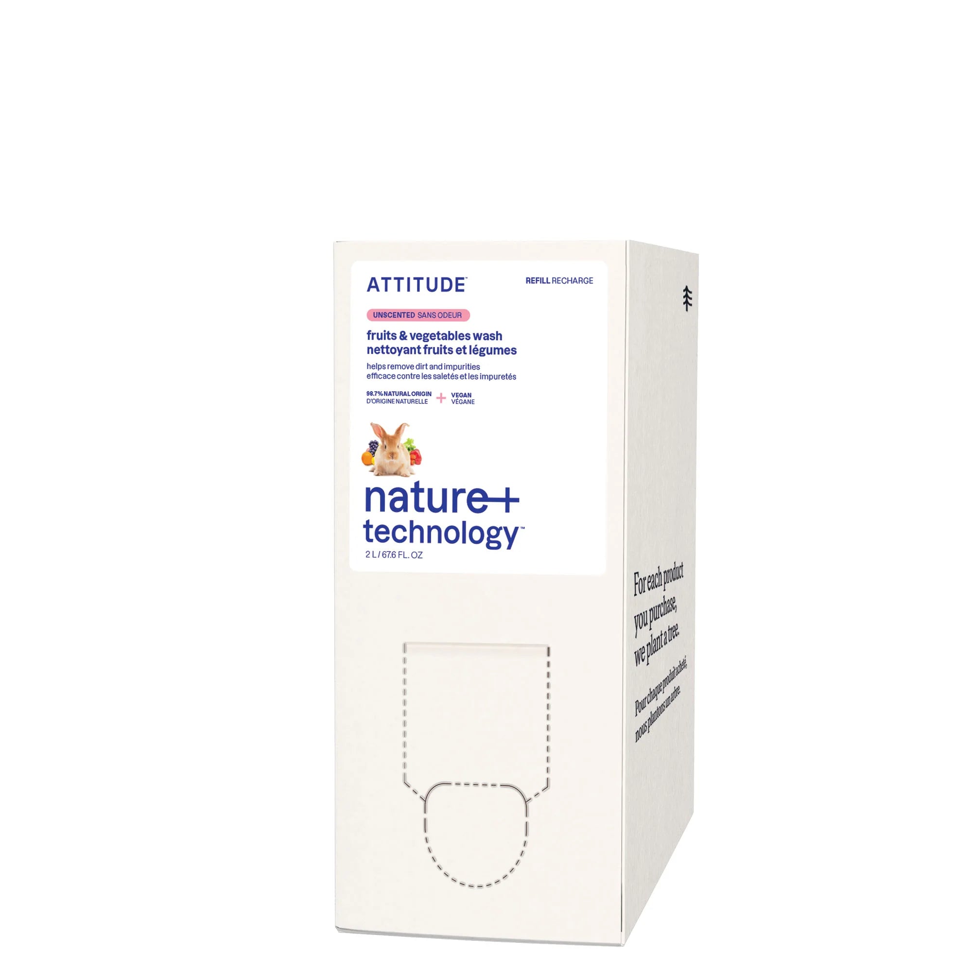 Formulated with 94% naturally derived ingredients, ATTITUDE⢠fruit & vegetable wash â unscented is practical because it can be sprayed directly on fruits and vegetables or used as a soaking solution. Its vegan and cruelty-free formula is offered in a 2L eco-refill format thatâs easy to carry and refill at home, meaning you can wash and eat your fresh produce worry-free.