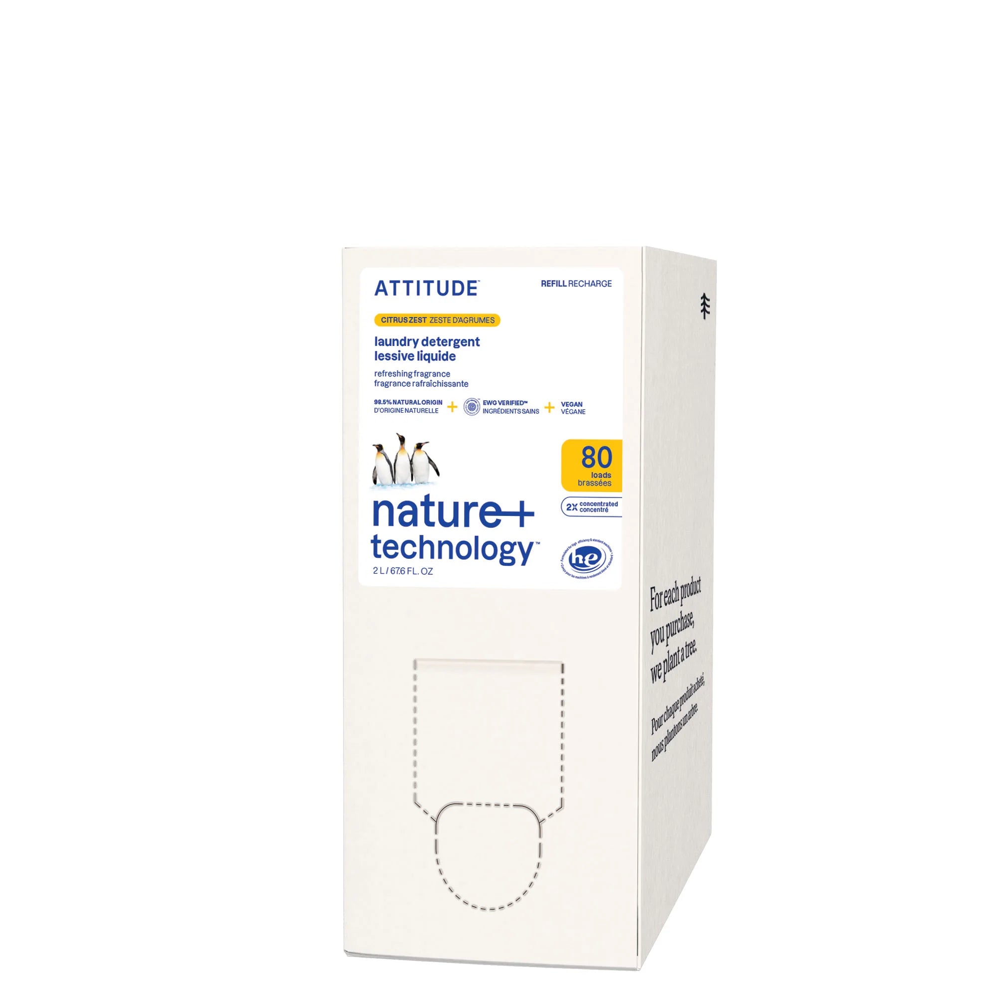 Formulated with 98% naturally derived ingredients, ATTITUDE⢠laundry detergent packs excellent detergent power and is free of enzymes. Its invigorating citrus top notes blend harmoniously with floral and herbaceous lavender. Its concentrated formula allows you to do more loads while using the same amount of detergent. Our laundry detergent is effective for cold water wash, saving you energy. Its vegan formula is certified by PETA and is offered in a 2L eco-refill format thatâs easy to carry and use at home.