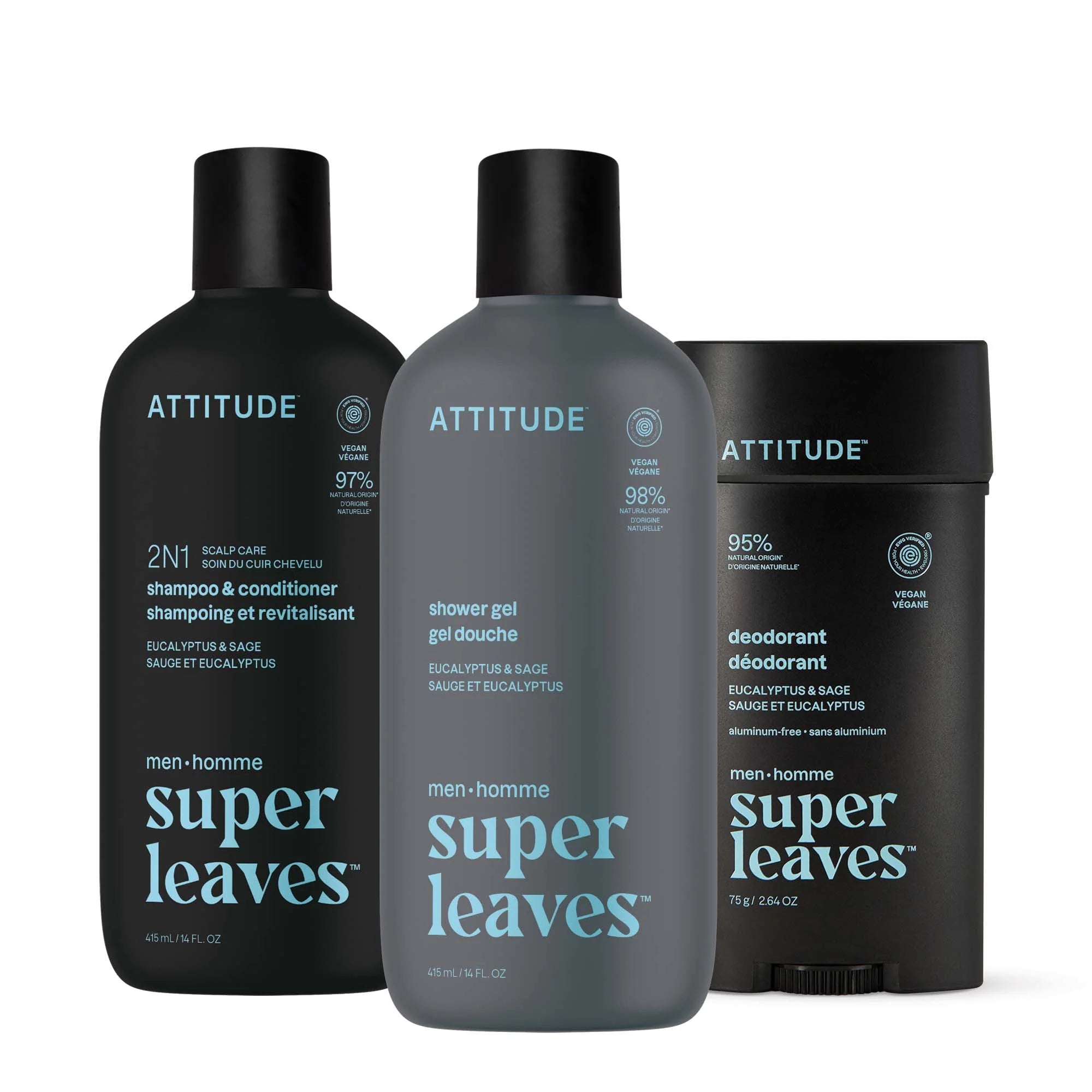 Elevate your daily routine with our complete men's grooming bundle. This bundle includes men's deodorant, men's body wash, and men's shampoo and conditioner, all formulated with over 95% naturally derived ingredients*. Our EWG Verified® vegan formulas deliver high-performance results, while the invigorating scent refreshes your senses and prepares you to tackle the day ahead.Â